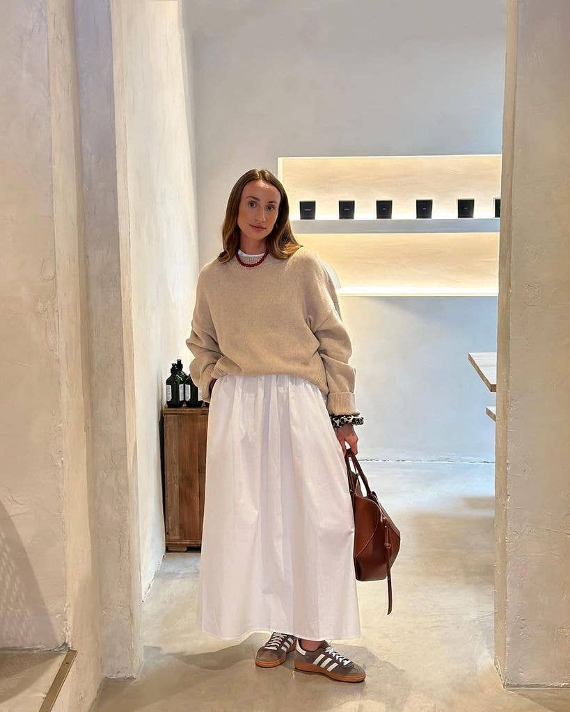 Maxi skirts in all shapes and colours rule. Influencer Karolina Grzyb is giving me inspiration with her white skirt and beige knit, an easy outfit to replicate and flattering for all shapes and sizes.