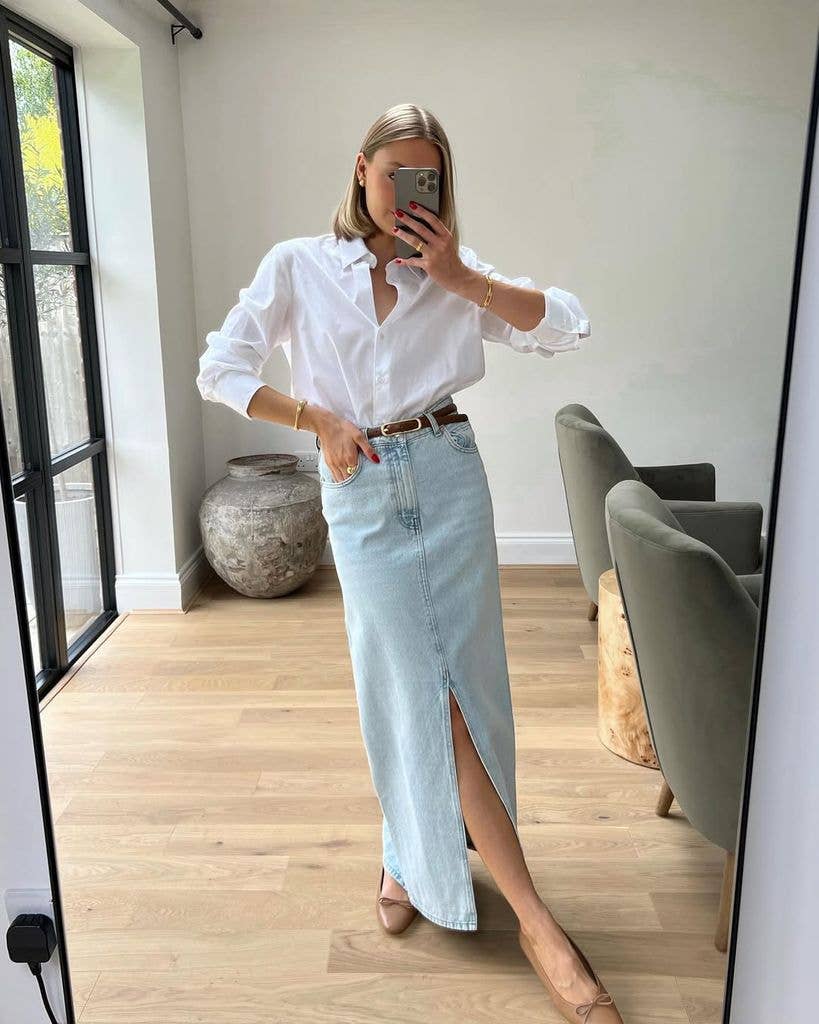 Lydia Tomlinson smartens up a denim maxi skirt, proving it can be both smart and casual.