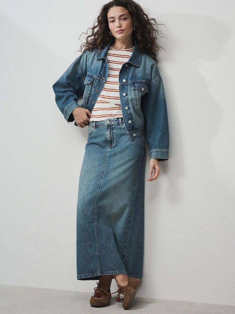 Before you think the maxi skirt trend of 2026 isn’t for you, or that they’re strictly for summer, don’t rule out the favourite frontrunner, the denim maxi skirt, which is still a best buy. A more chic alternative to jeans, they’re selling strong.