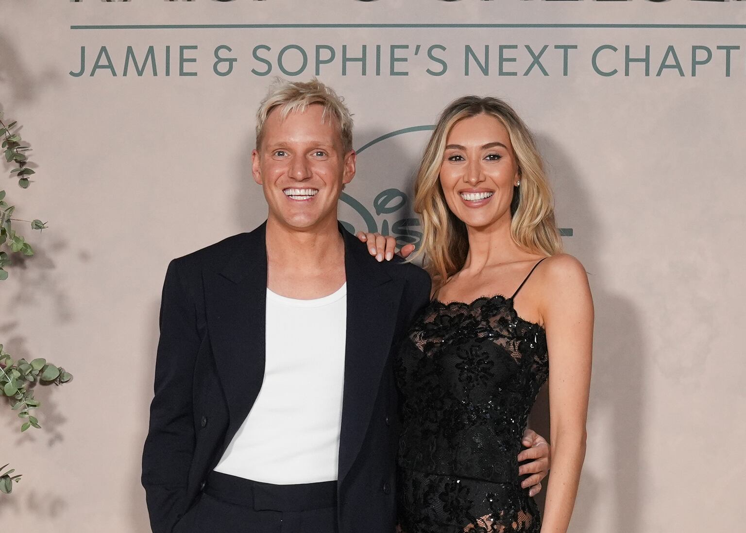 The Warwickshire-born star posed with her husband and former Made In Chelsea co-star, Jamie Laing, who opted for a casual look – a black suit over a white t-shirt.
